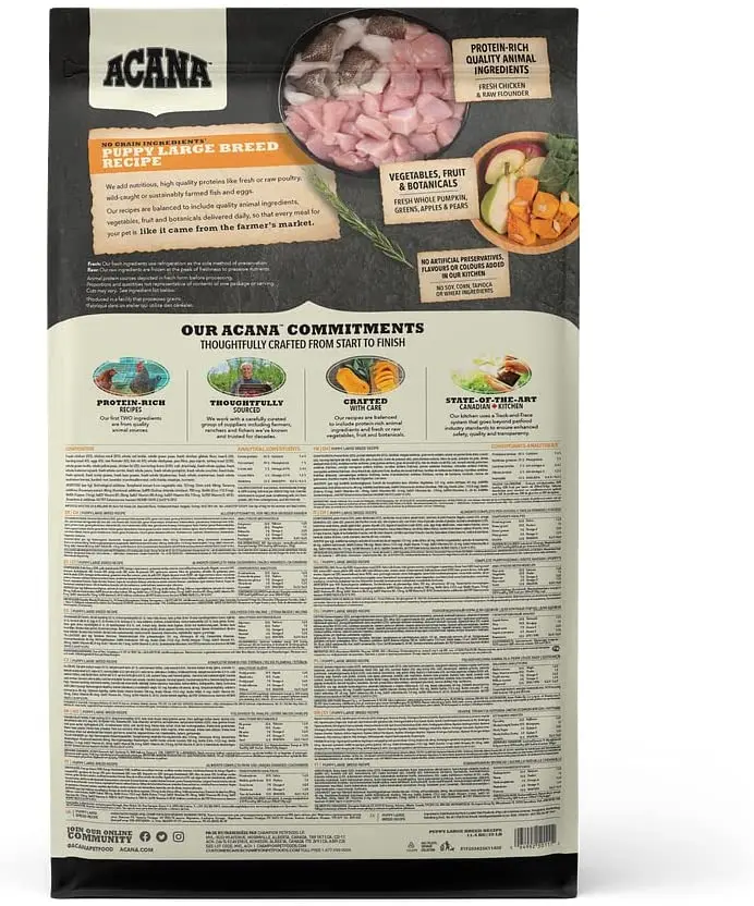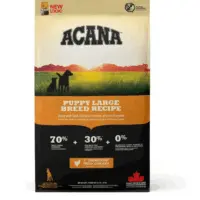 ACANA® Puppy Large Breed Recipe is thoughtfully crafted to nurture growing puppies of all breeds. Rich with 70% quality animal ingredients like fresh Canadian chicken and raw flounder balanced with 30% fruit, vegetables & botanicals, this recipe is specially formulated to provide your growing large to giant breed puppy with the protein and nutrition they need to support their rapid development.
