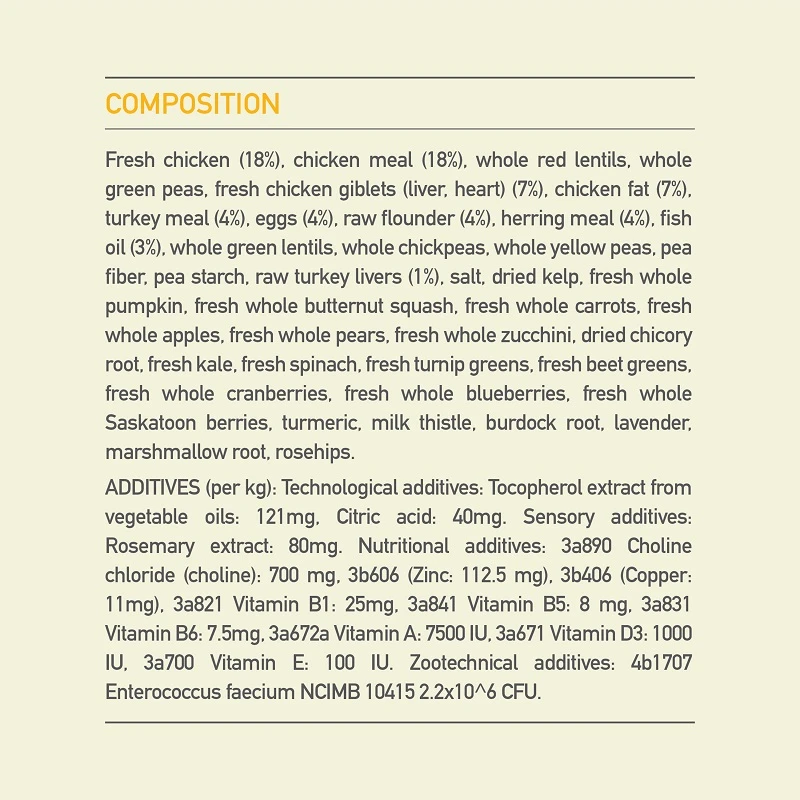 Fresh chicken (22%), chicken meal (21%), whole red lentils, whole green peas, fresh chicken giblets (liver, heart) (6%), herring meal (4%), eggs (4%), raw flounder (4%), fish oil (4%), whole chickpeas, pea fibre, pea starch, turkey meal (2.5%), whole green lentils, whole yellow peas, chicken fat (2%), raw turkey livers (0.5%), salt, dried kelp, fresh whole apples, fresh whole butternut squash, fresh whole carrots, fresh whole pears, fresh whole pumpkin, fresh whole zucchini, fresh kale, fresh spinach, fresh turnip greens, fresh beet greens, fresh whole blueberries, fresh whole cranberries, fresh whole saskatoon berries, burdock root, lavender, marshmallow root, milk thistle, rosehips, turmeric.