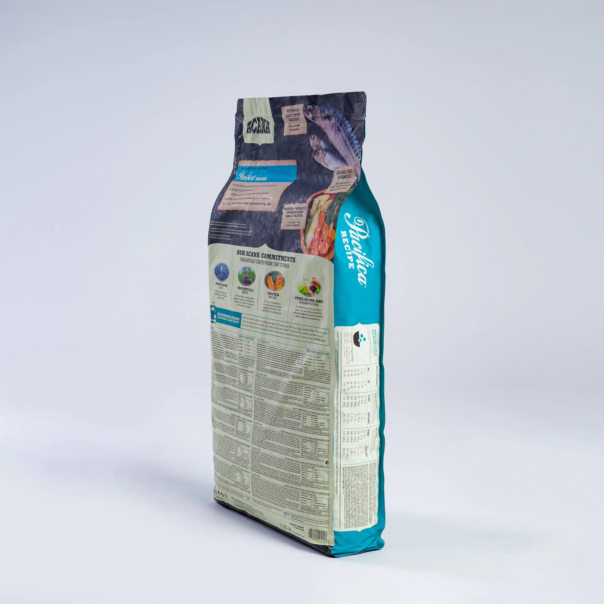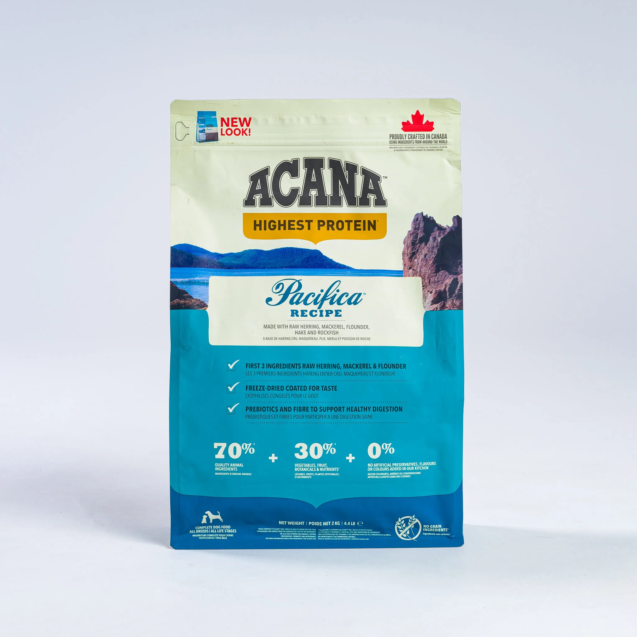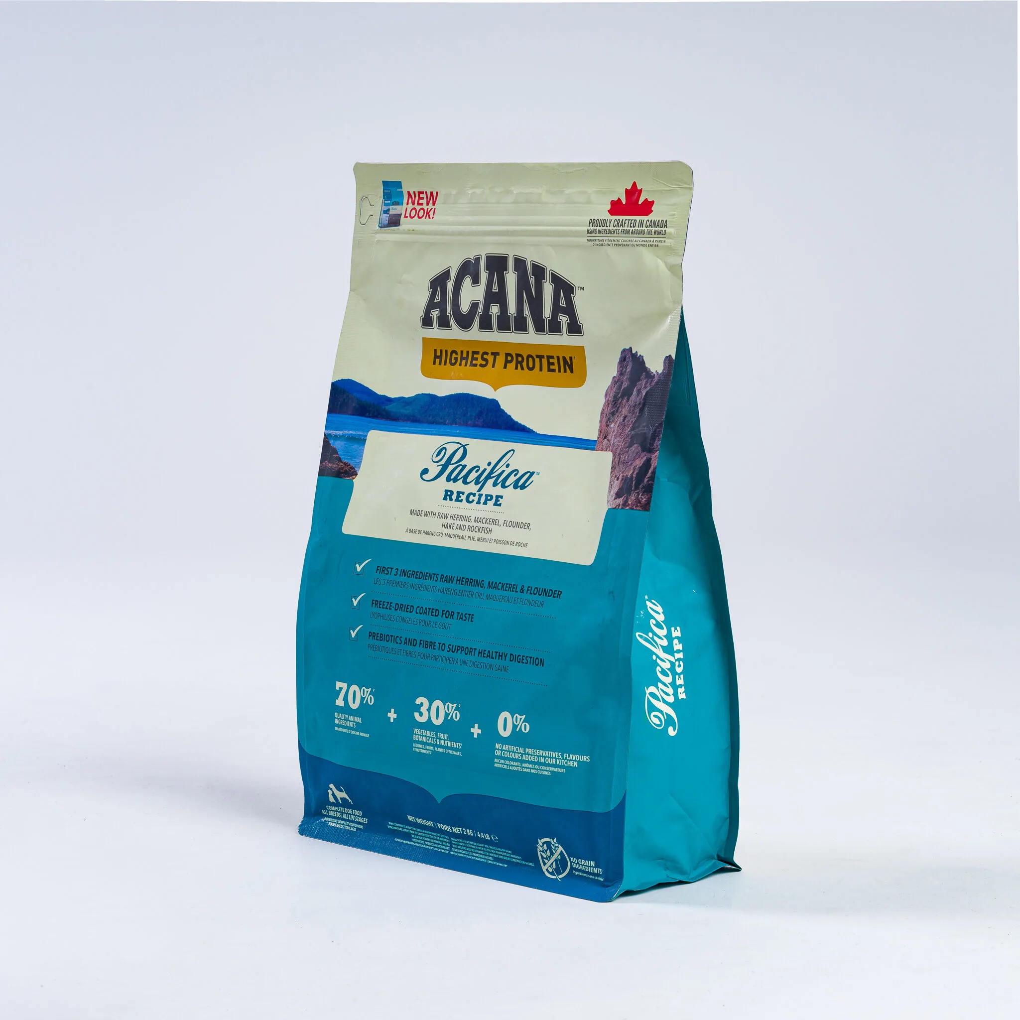 With the highest protein offering in ACANA® pet foods, this recipe is rich with 70% quality animal ingredients like whole mackerel, herring, rockfish, hake, and flounder, balanced with 30% fruits, vegetables, and botanicals, many delivered daily. Artificial colours, flavours or preservatives are never added.