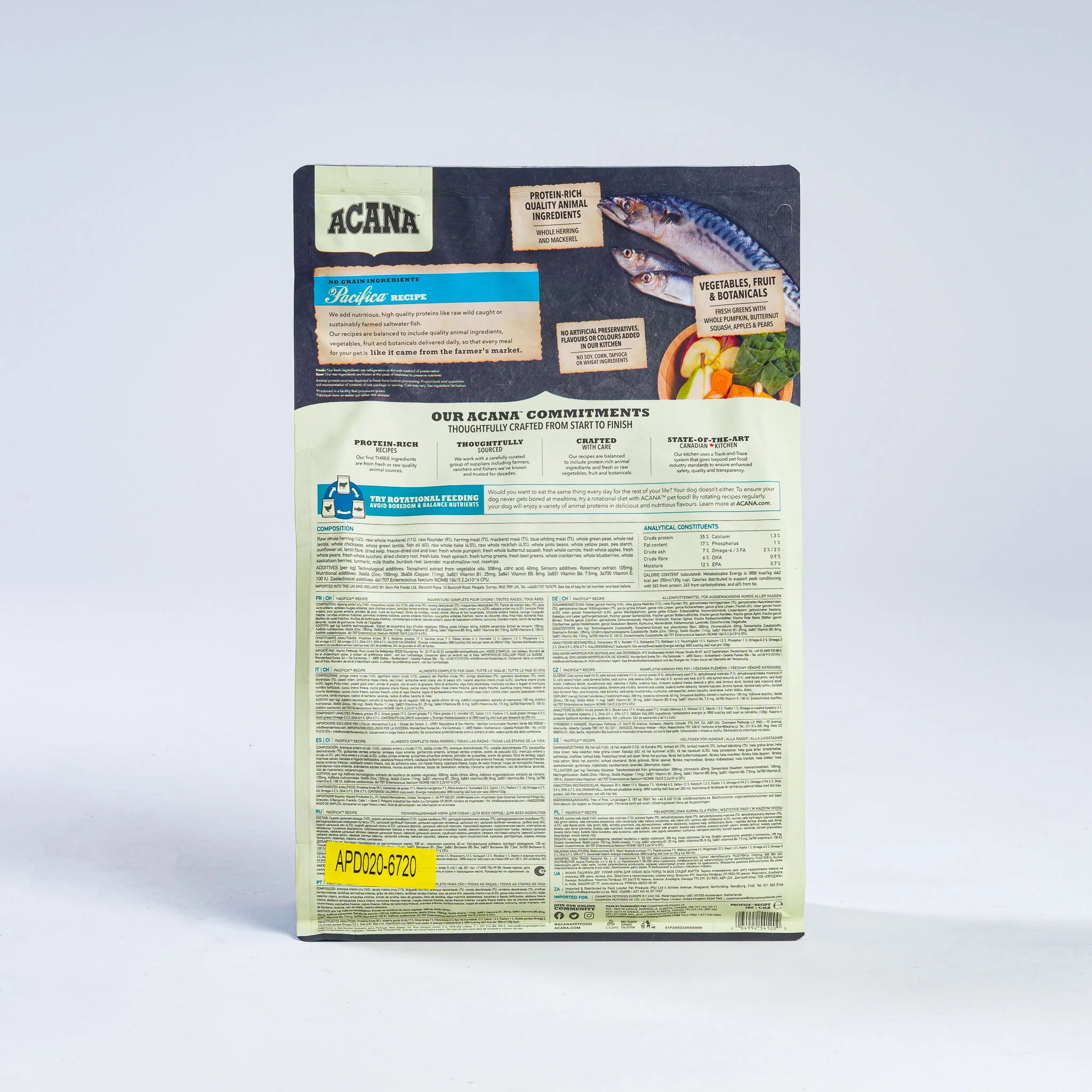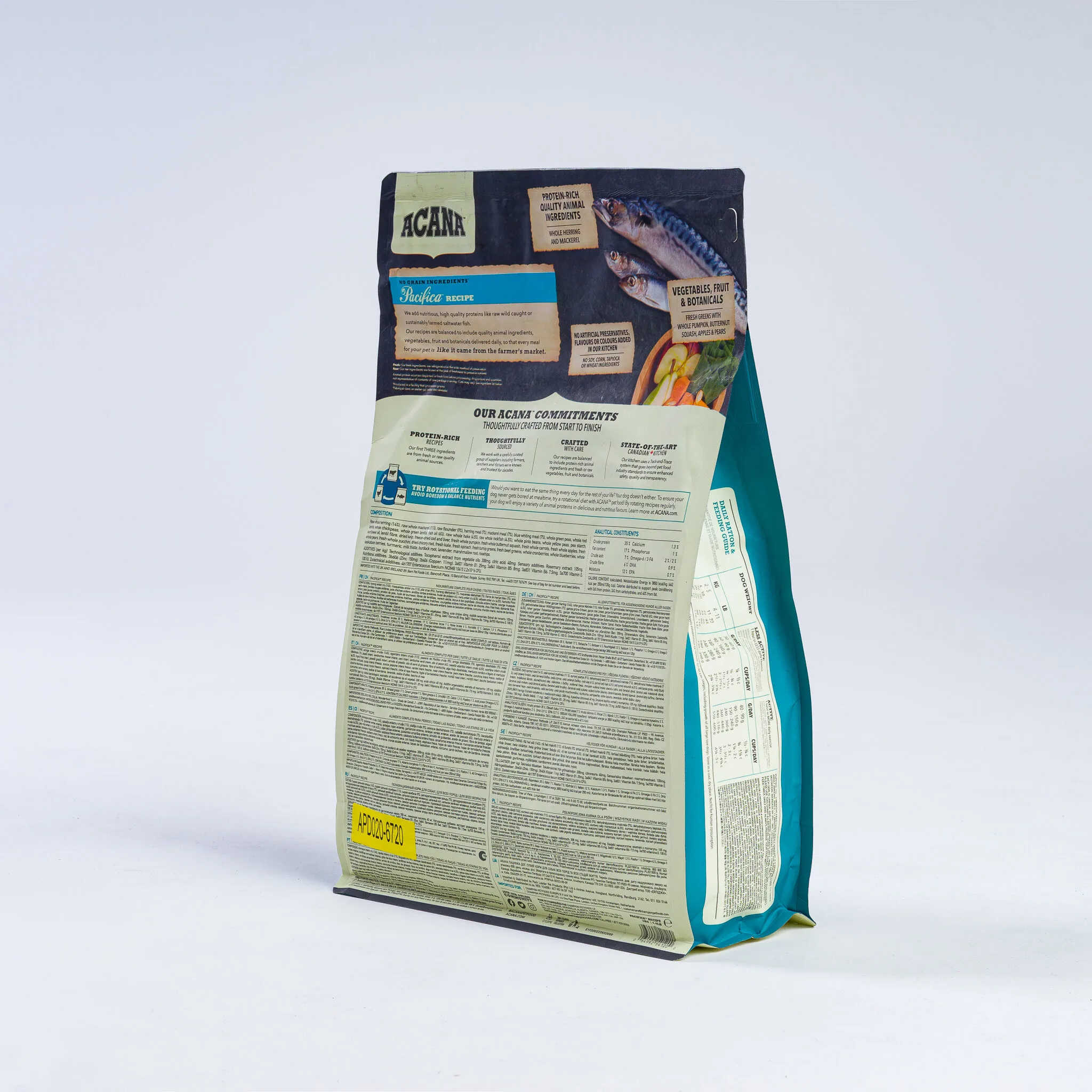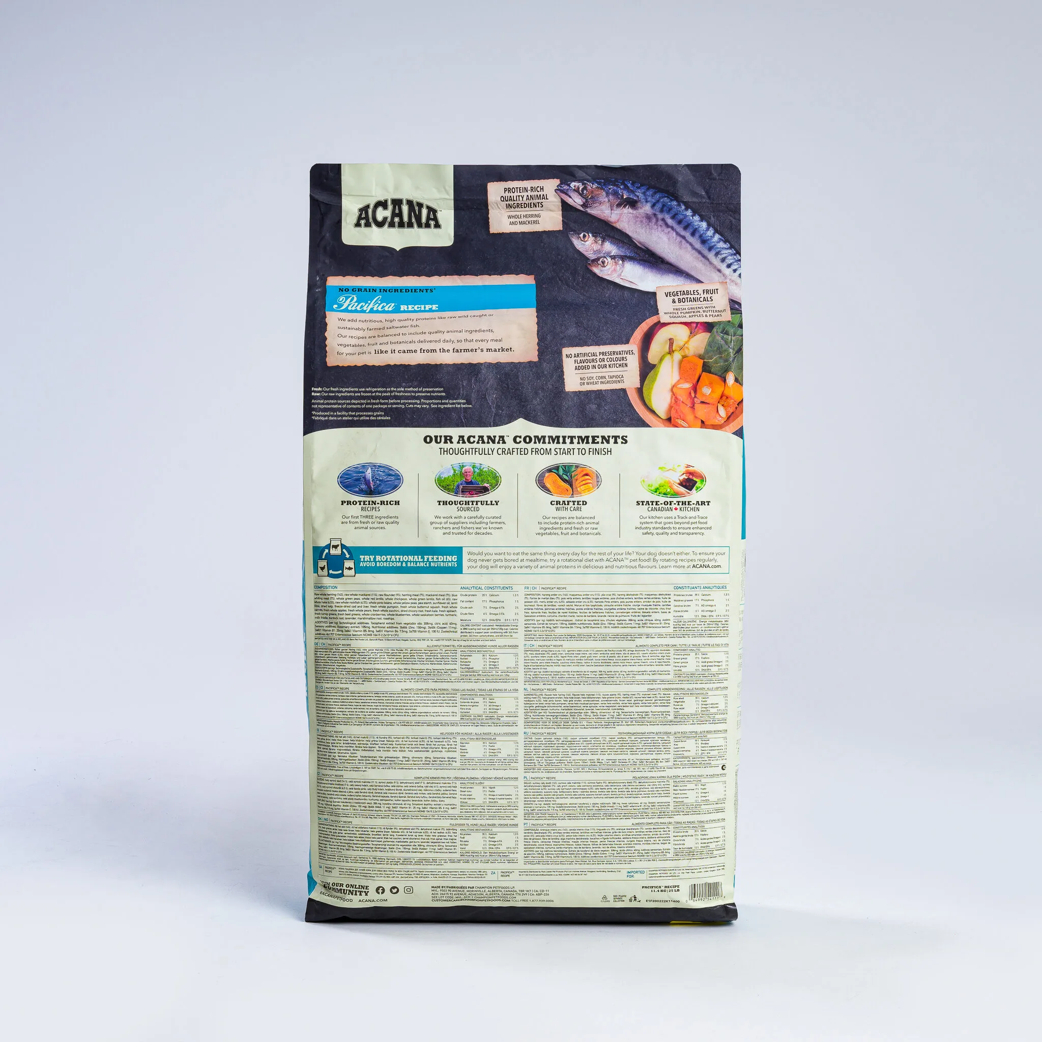 With the highest protein offering in ACANA® pet foods, this recipe is rich with 70% quality animal ingredients like whole mackerel, herring, rockfish, hake, and flounder, balanced with 30% fruits, vegetables, and botanicals, many delivered daily. Artificial colours, flavours or preservatives are never added.