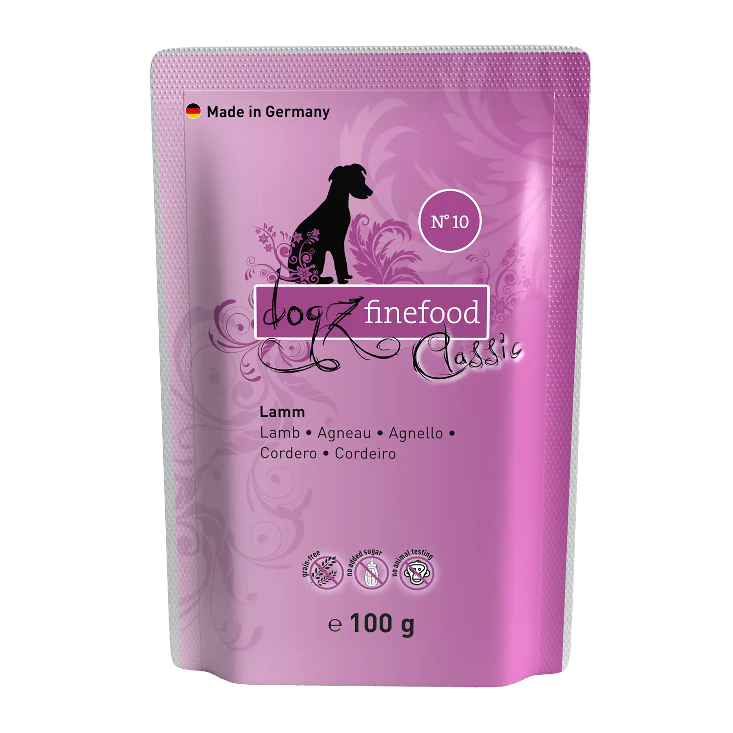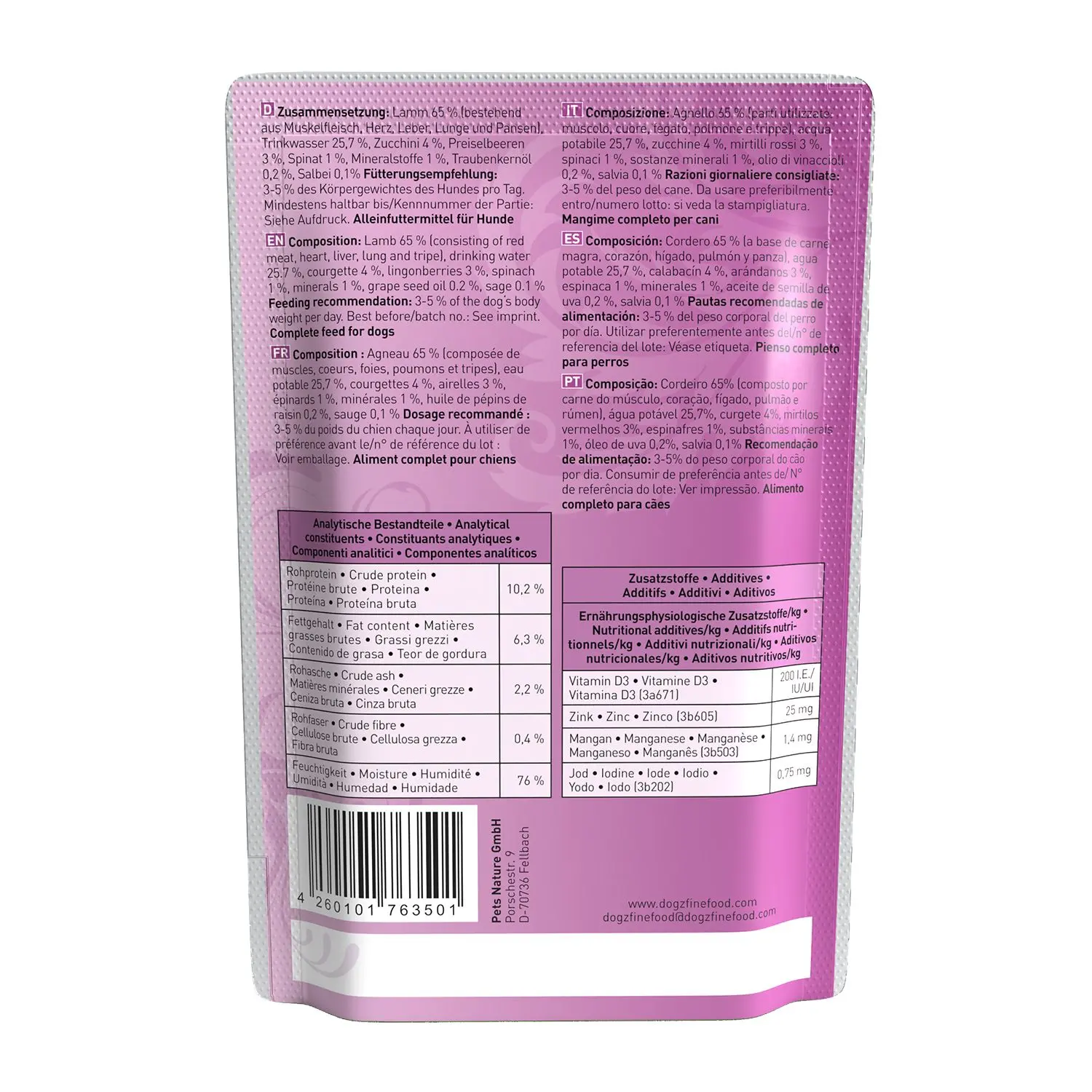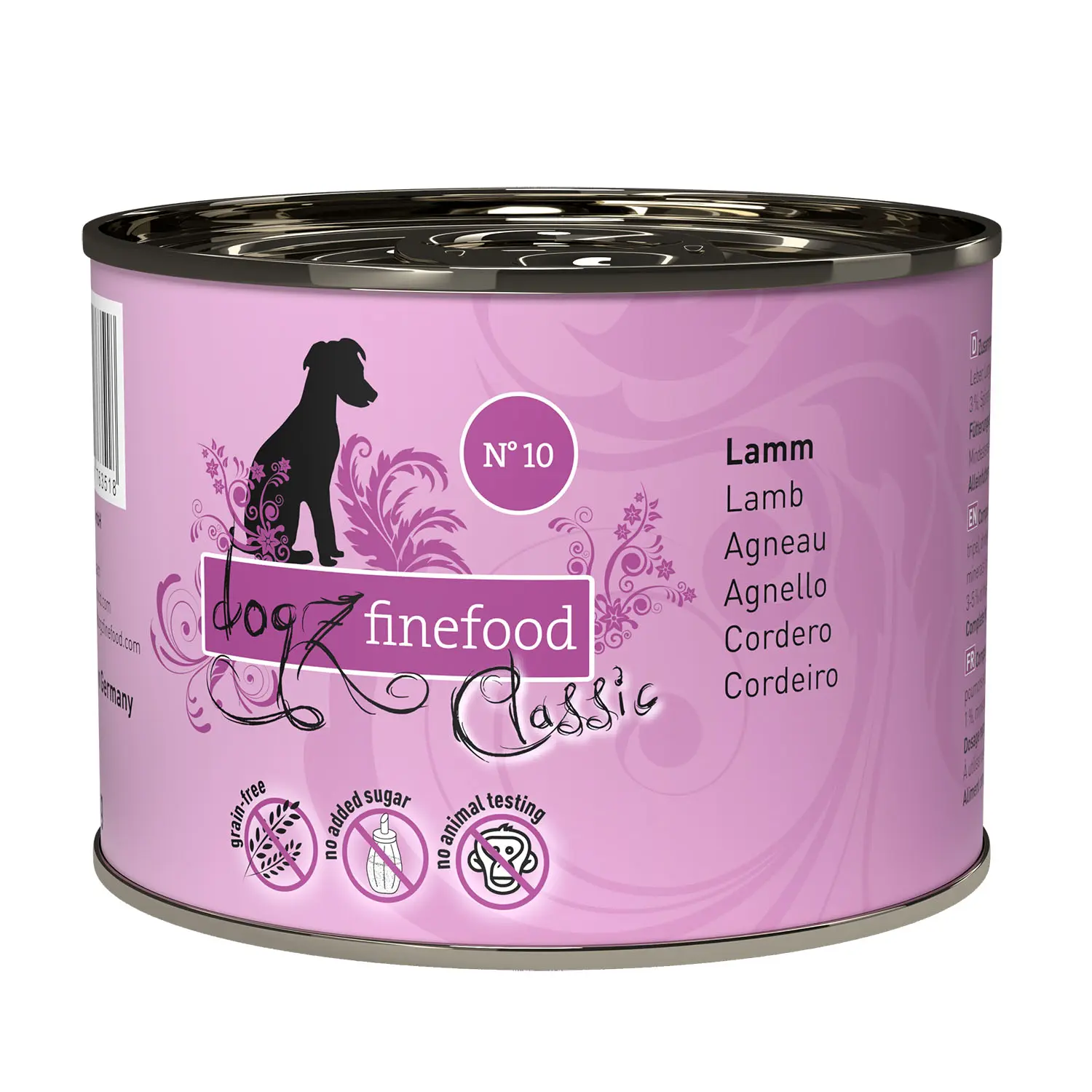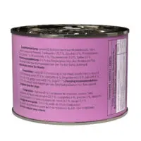 Lamb 65% (consisting of red meat, heart, liver, lung and tripe), potable water 25.7%, courgette 4%, lingonberries 3%, spinach 1%, minerals 1%, grape seed oil 0.2%, sage 0.1%.