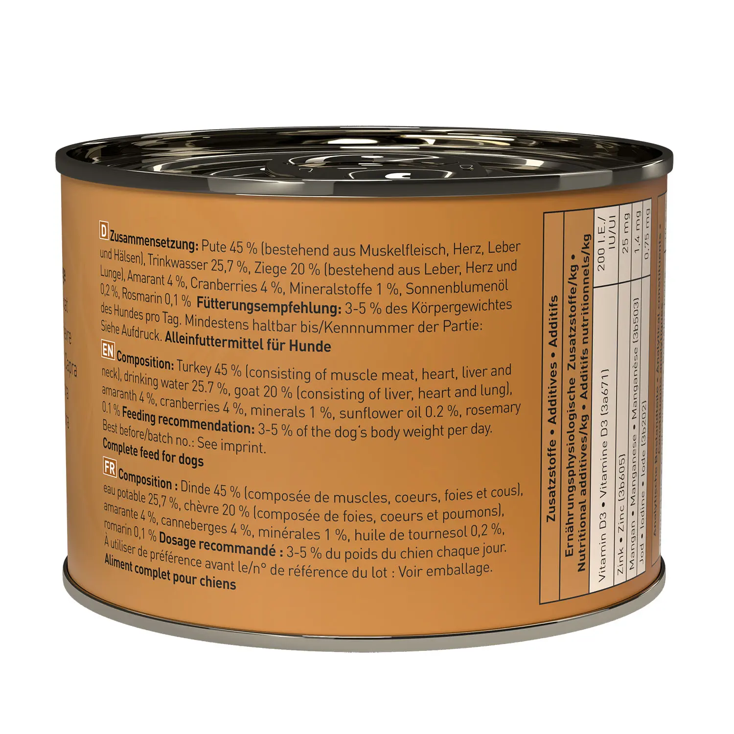 A grain-free wet food for nutritionally sensitive dogs with a high percentage of delicious turkey and goat and valuable ingredients such as amaranth, rosemary and cranberry. Guaranteed without preservatives, flavor enhancers or artificial colors and, of course, GMO-free.