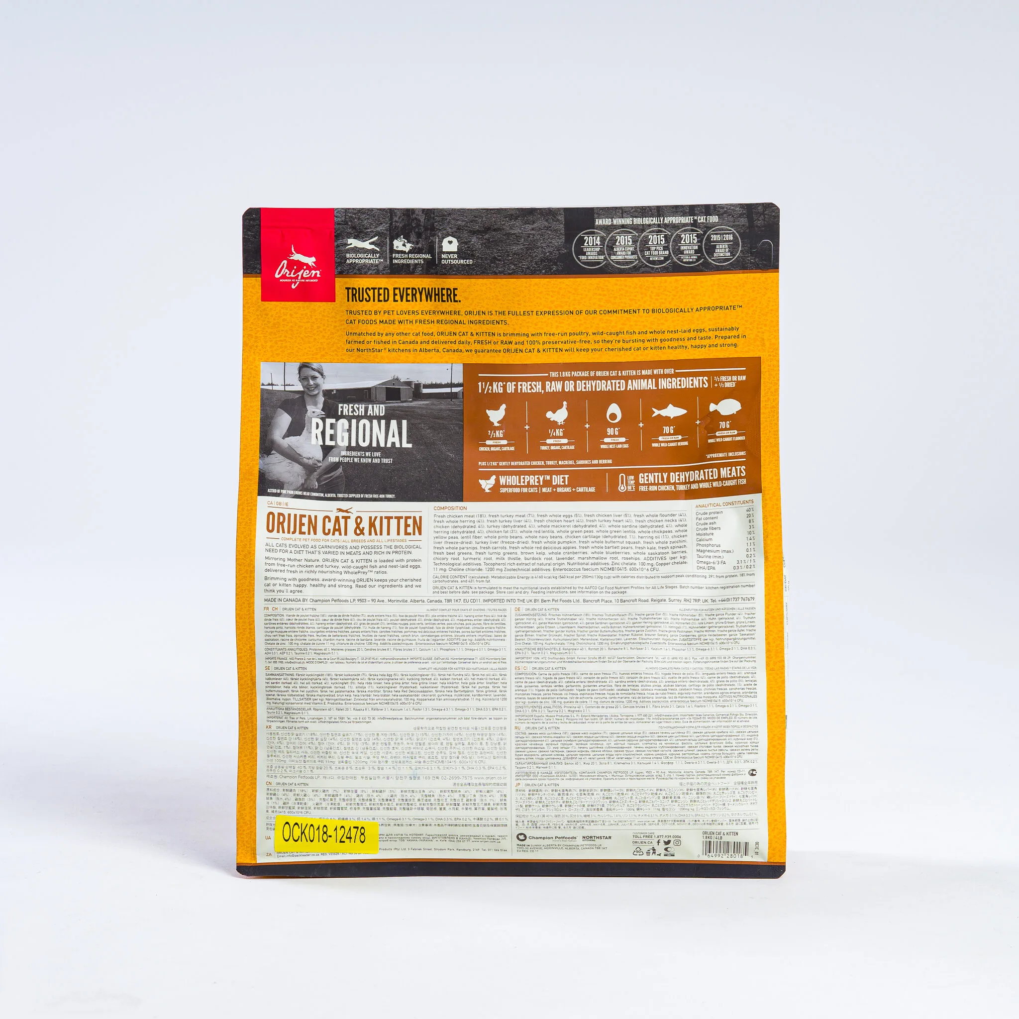 ORIJENĀ® Cat & Kitten diet is made with fresh or raw free-run chicken and turkey and wild-caught fish. Packed with WholePrey animal ingredients like poultry, fish, organs and bone, this food is made with the most nutrient-dense, succulent parts of the prey to deliver the nutrition cats need. With 85% quality animal ingredients and a freeze-dried liver coating, this diet is beyond comparison.