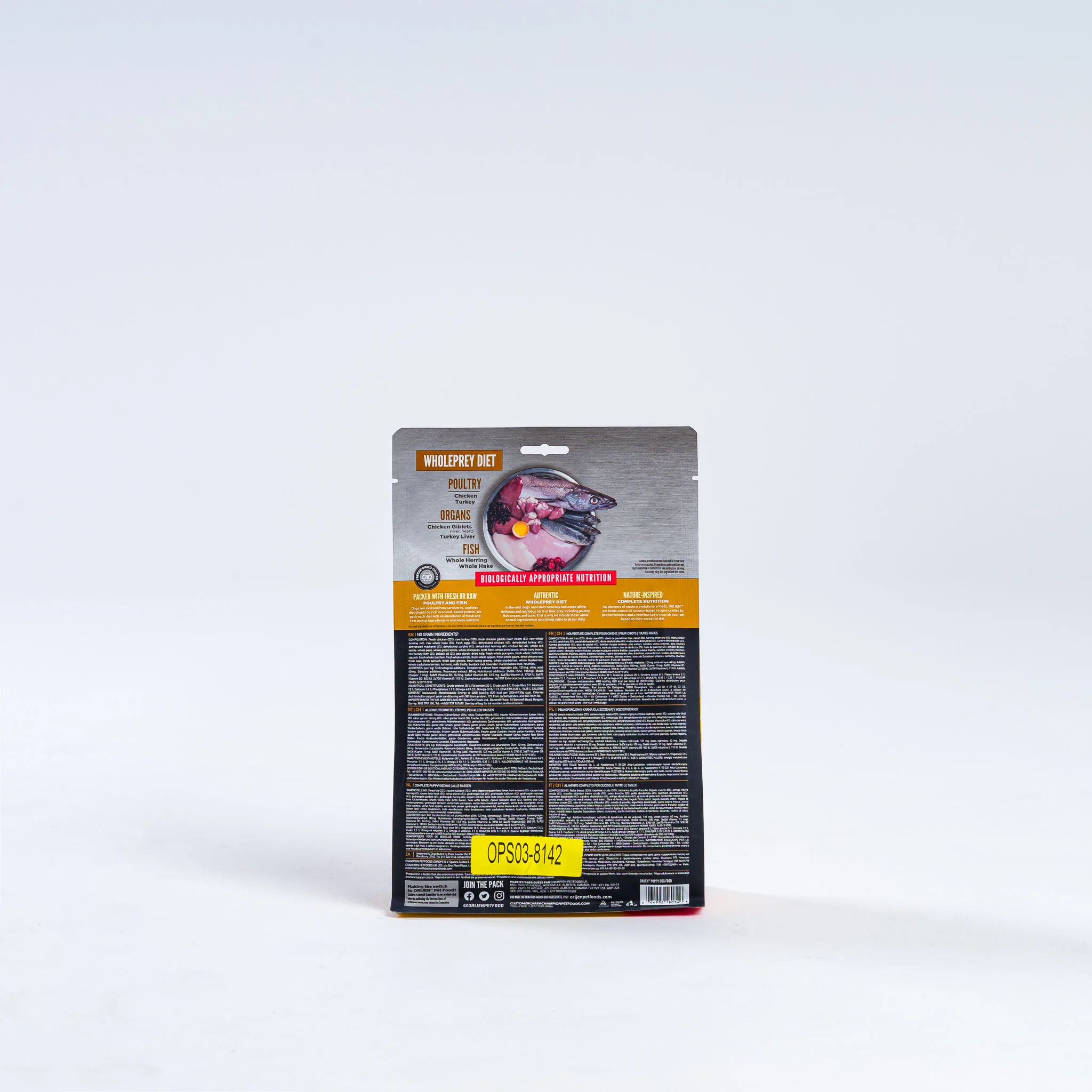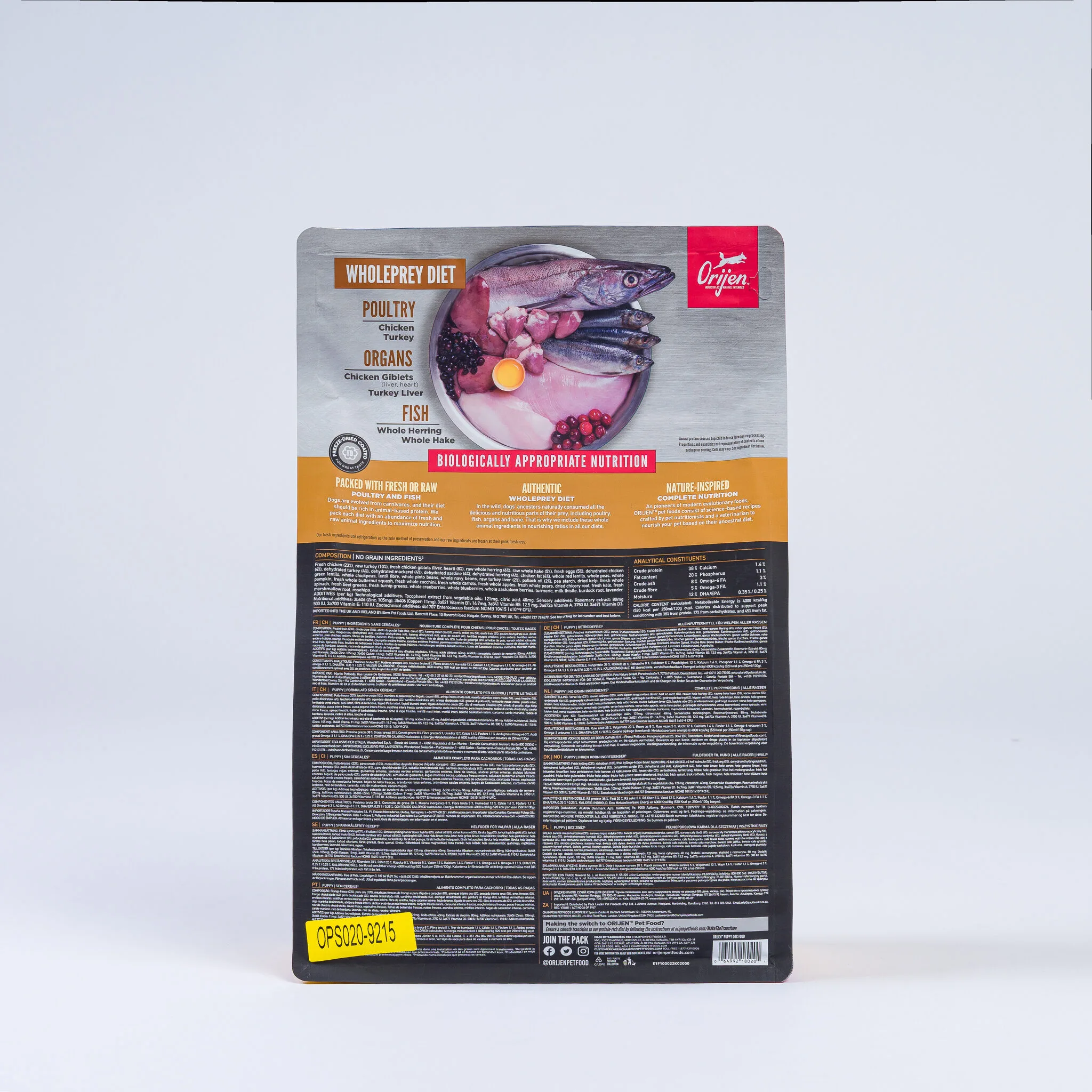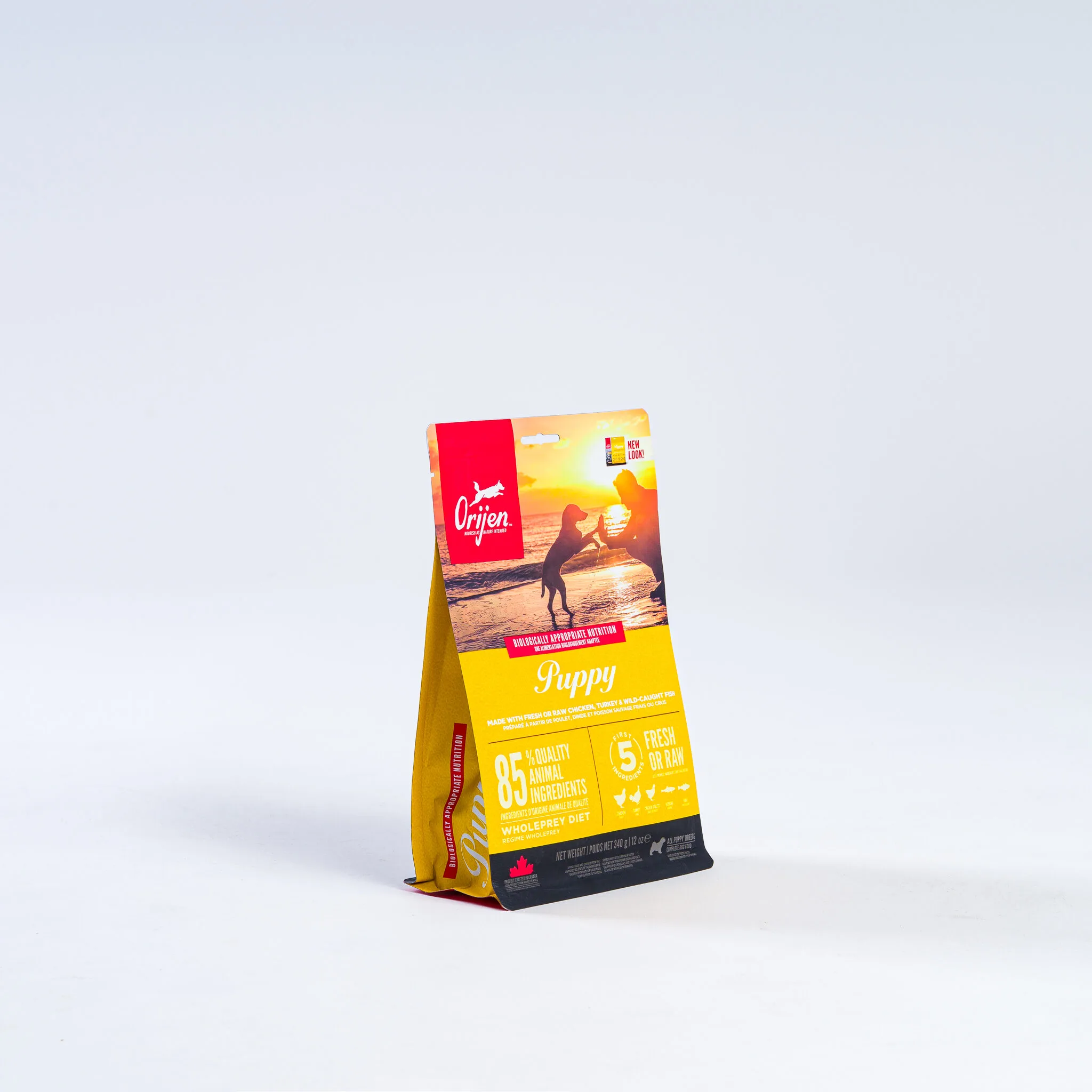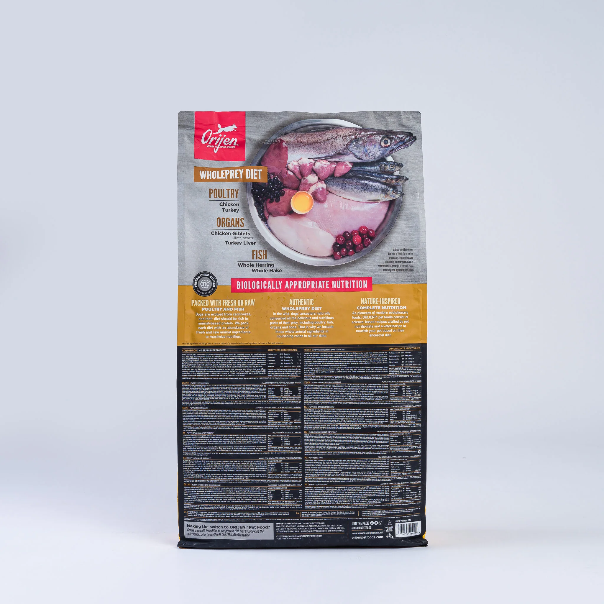 ORIJENĀ® Puppy diet is packed with 85% quality animal ingredients like fresh or raw free-run chicken and turkey, and wild-caught or sustainably farmed fish. Packed with WholePrey animal ingredients like organs and bone, this food is made with the most nutrient-dense, succulent parts of the prey to deliver the nutrition puppies need.